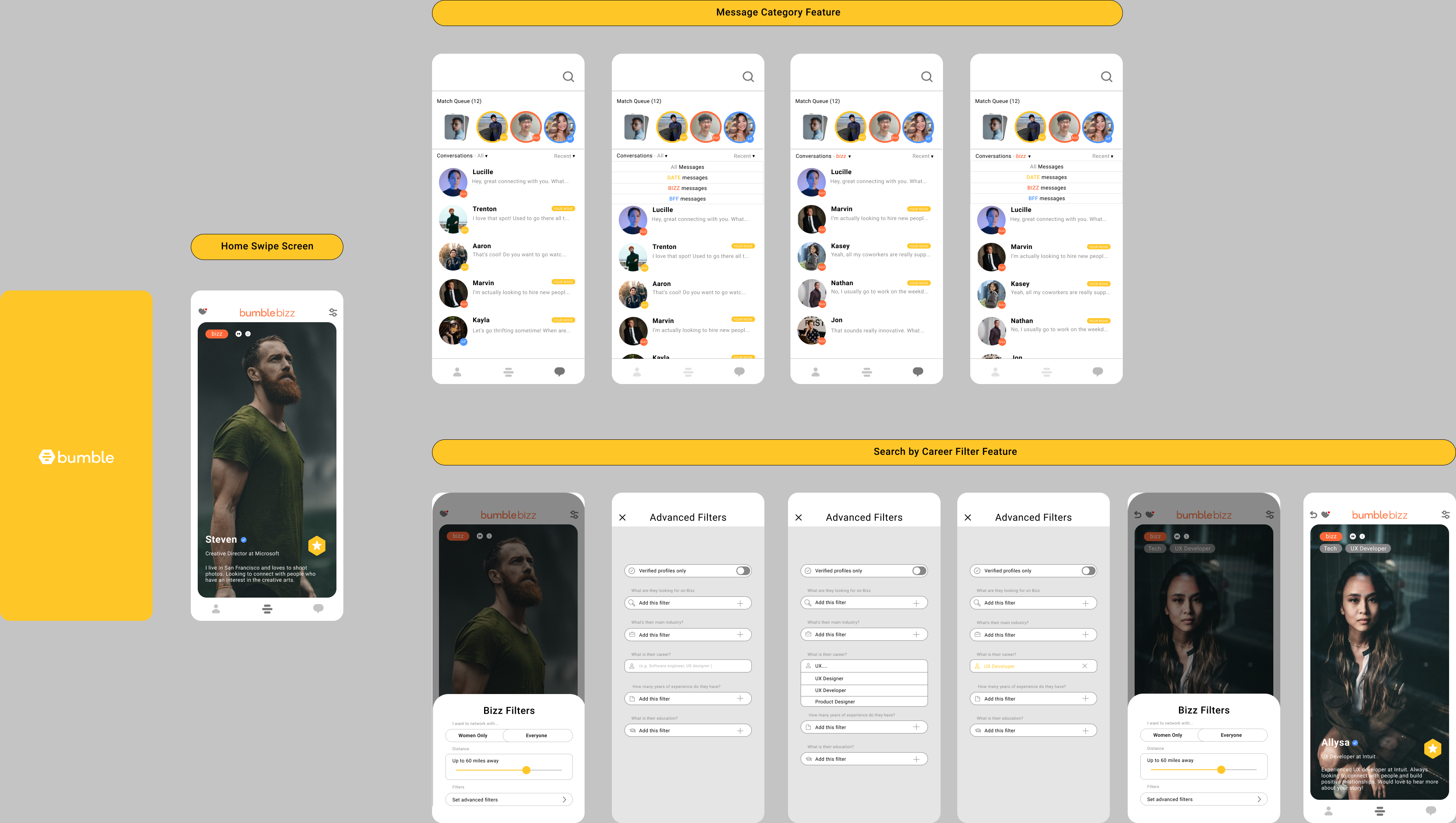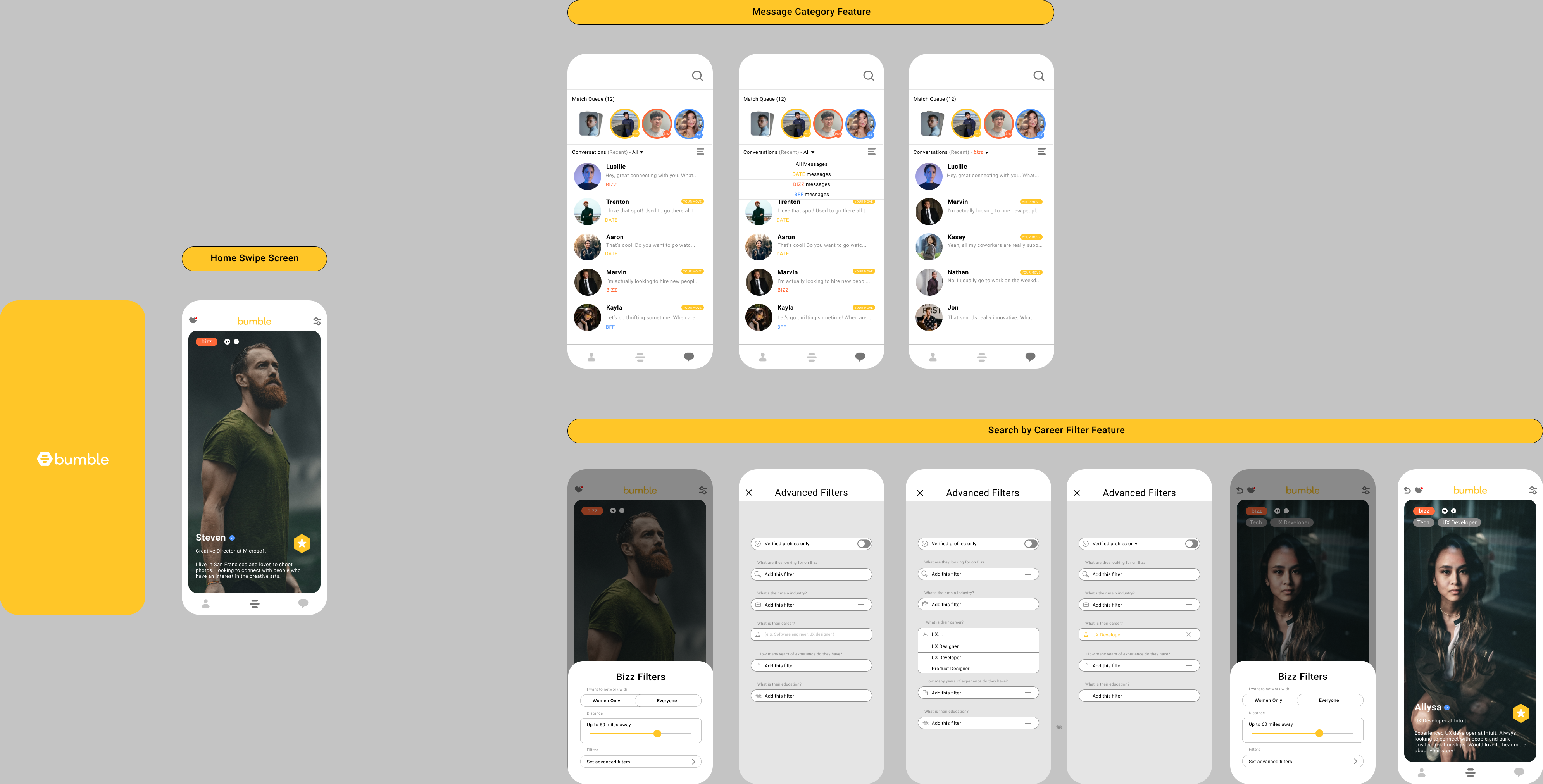 After creating our user personas, we came up with two functions we wanted to implement to improve the quality of use in Bumble Bizz. The first was the ability to sort out the messages in order to separate the three functions from each other. This feature was aimed at users like Jessica, would could be using the date function and Bizz function simultaneously, albeit with entirely different goals in each app. The other feature was implementing a career filter. Bumble Bizz already had functionality of filtering profiles by industry ( i.e. Tech, Arts, Healthcare, etc) but we thought it was important that people connect in certain career paths as well. This feature was considered for people like Jake, who are seeking to make specific connections within their work field, or new connections outside their career path. However, we wanted to make sure both features could improve the overall quality of use in Bumble Bizz so that all users could benefit.