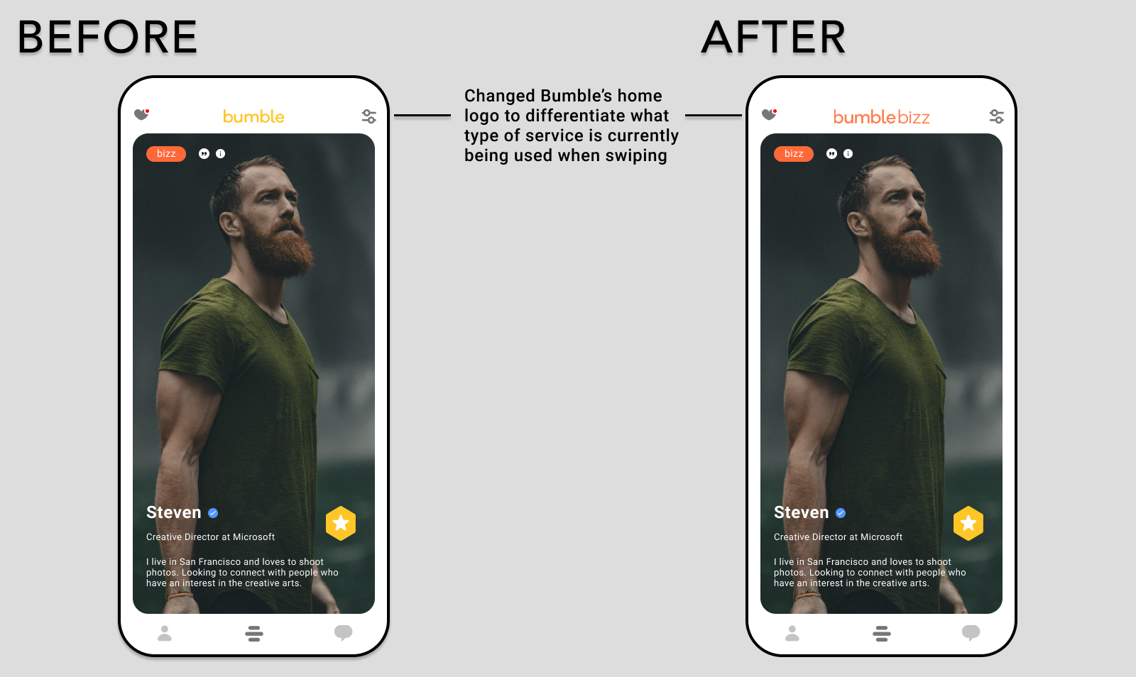 After: We changed the color and logo name to accurately depict what Bumble service the user is currently seeing on their swipe feed. Users won’t have to question what service they’re using since it’s clearly shown at the top of the swipe feed.