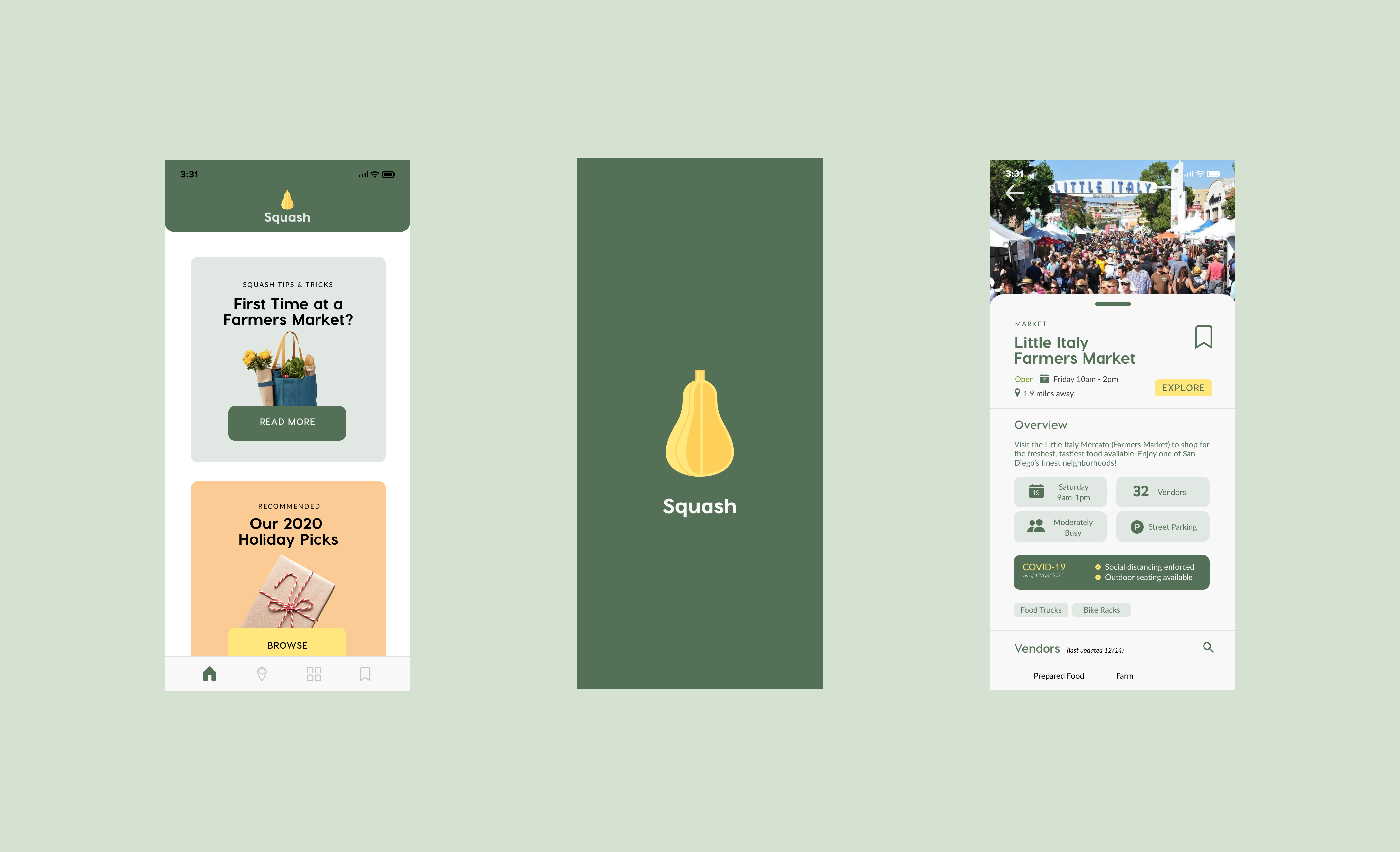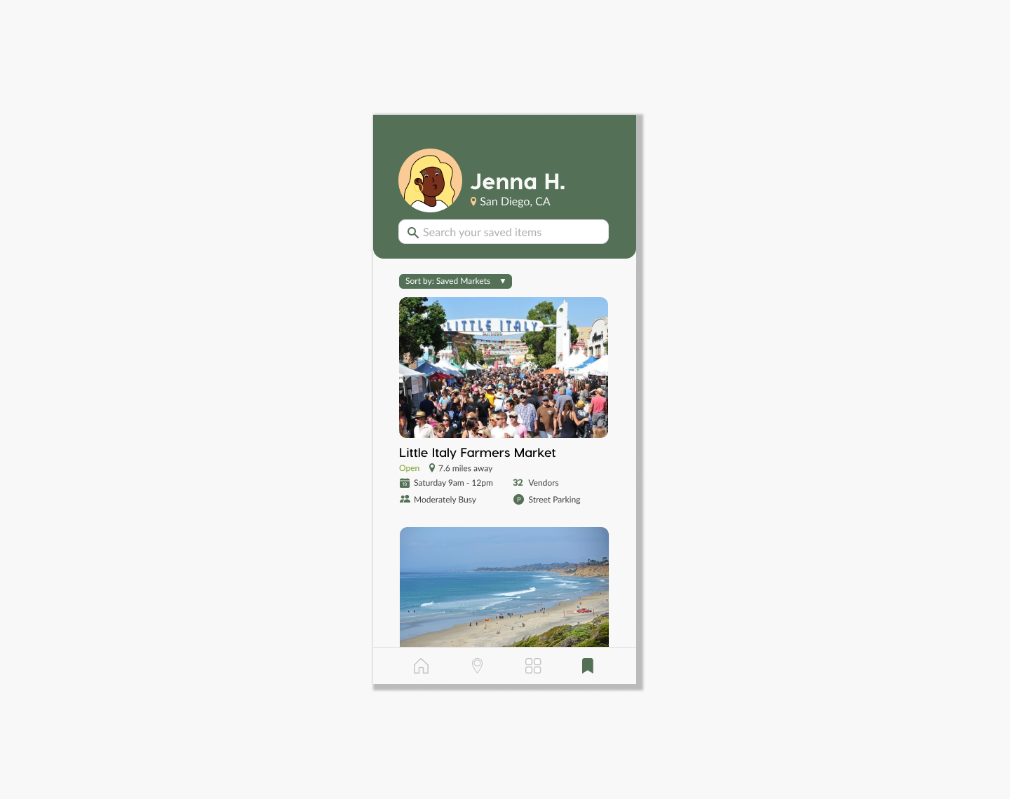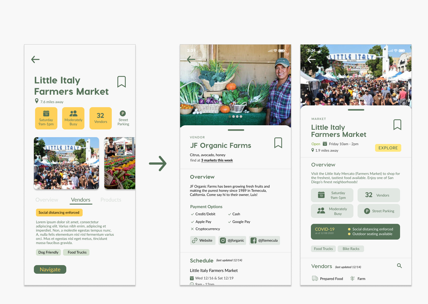 We moved on to creating our high fidelity prototype, and conducted another round of testing on our target users. One valuable insight from our high-fidelity user testing was that a user wanted to follow their favorite vendor from market to market. We realized that our current system was market-centric, and didn't offer flexibility for viewing the individuals vendors who move between multiple markets in a week. We designed pages for both vendors and markets that highlighted vendor/market-specific features and were organized by priority to the user. Additionally, the market/vendor card system was implemented with the development team in mind. We hoped that having a common point of reference would simplify the overall app architecture.