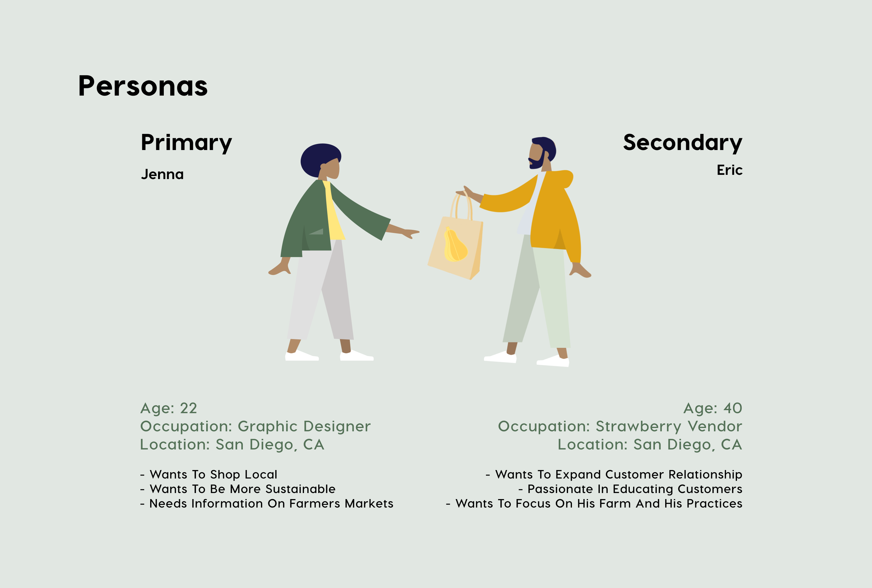 These above insights really informed our personas by showing us the vast difference in needs between our primary users, farmers market attendees, and the secondary user, vendors. Even though we had a diverse range of ages in mind for our potential users, our largest user base would be ages 20-30 who have the greatest incentive to use our app. We knew that a digital native, fresh out of college would have the desire to start shopping at farmers markets but none of the knowledge a more experienced shopper would possess.