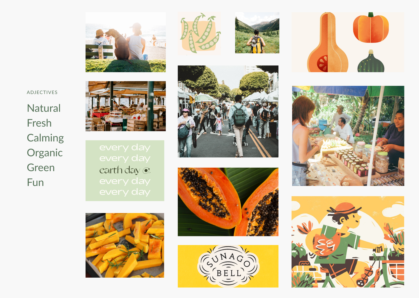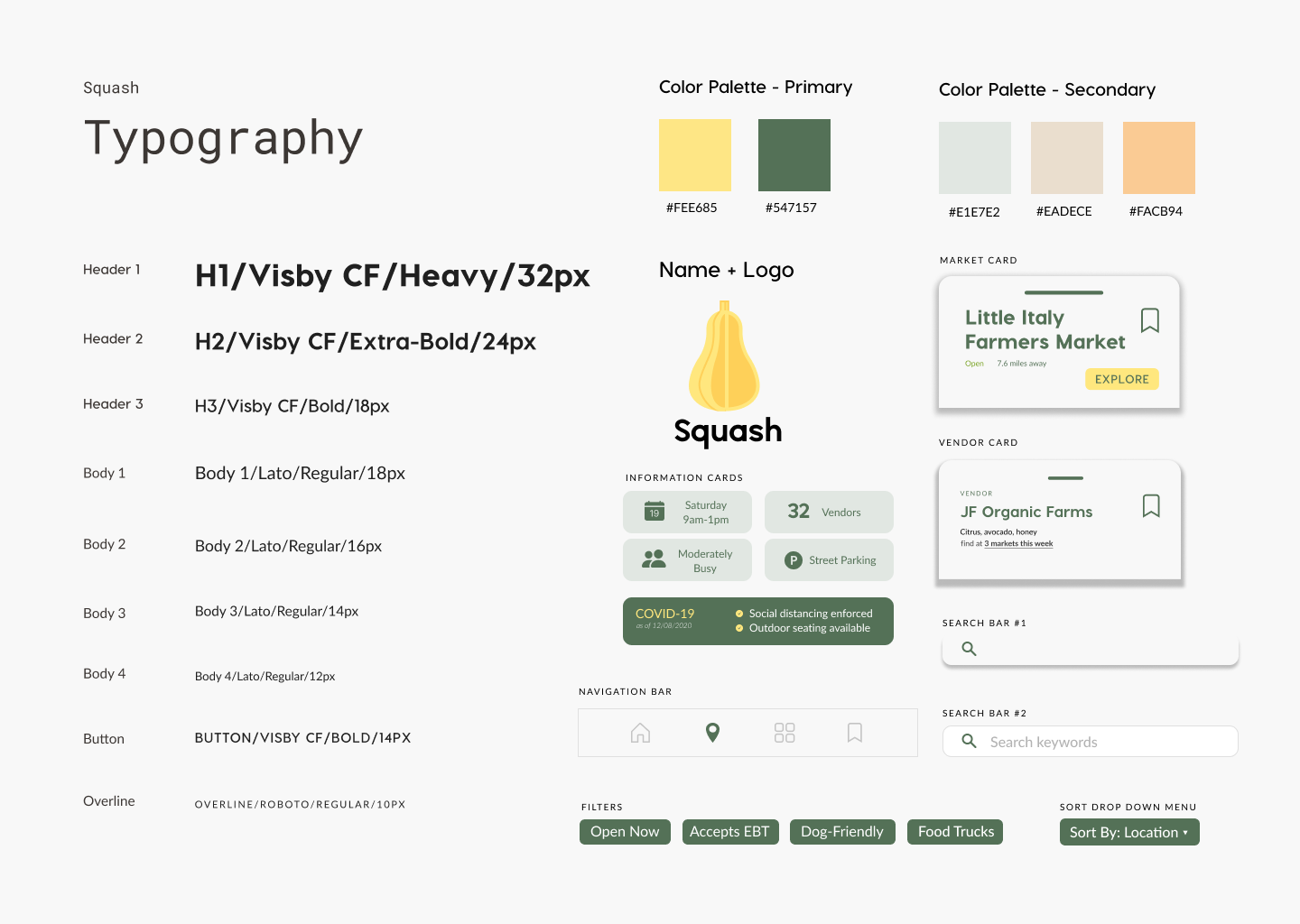 I really enjoyed creating a mood board and style board for this project because of how much I learned working with my teammates. We were asked to create a logo and title for our app, even though we were not taught how to effectively create branding. We opted to go through a bottom up process, using our mood board and eventual style sheet to inform the direction of our app's branding. Our color palette reflected our desire to capture the laidback and natural vibe of farmers markets.