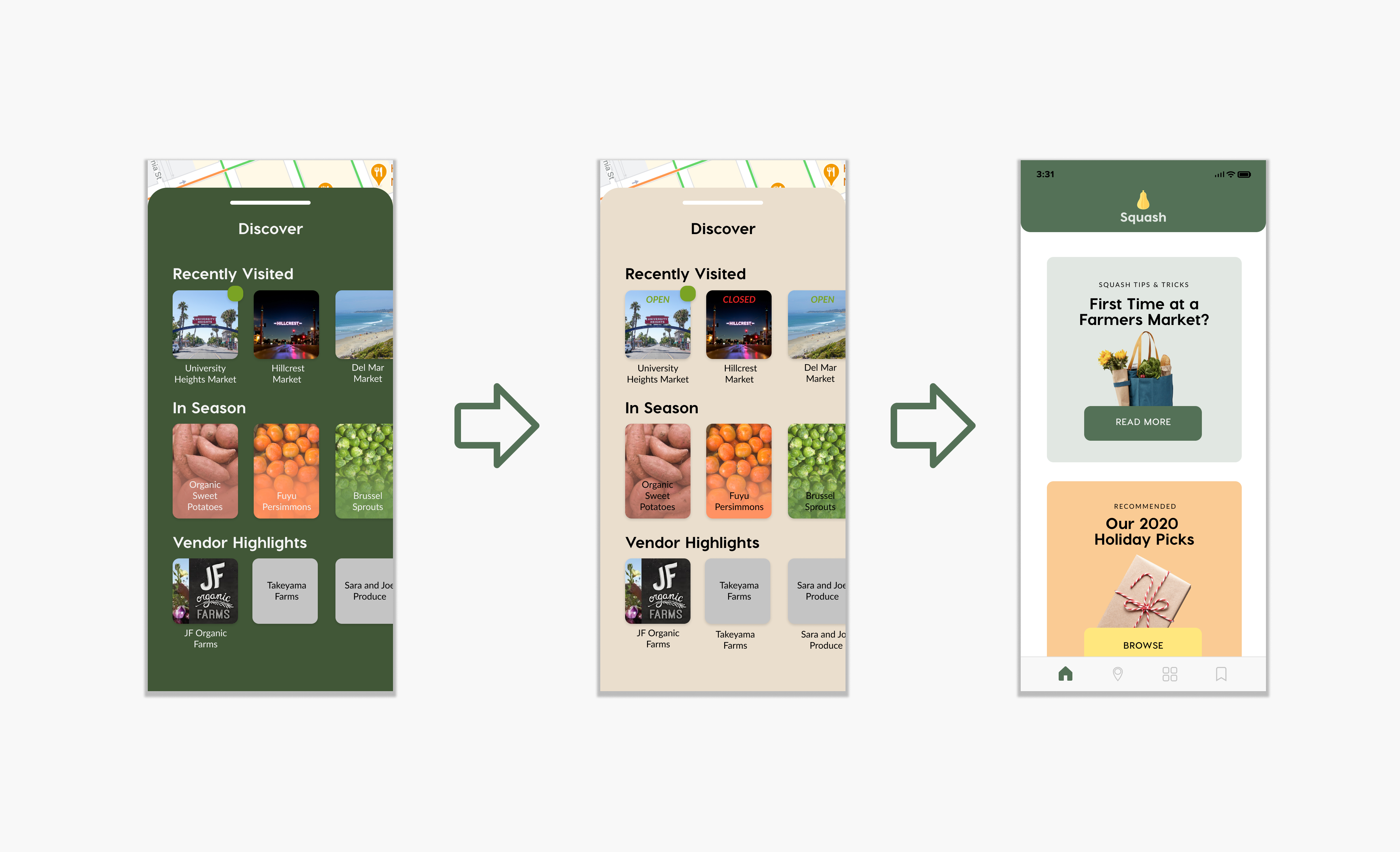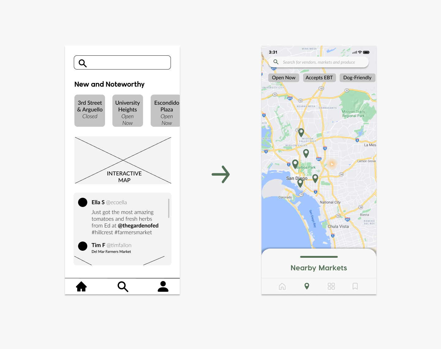 Based on our personal experiences with farmers markets, we wanted our app to be 100% experience focused. Each feature of our app seeks to eliminate an obstacle between the user and their potential trip to a local farmers market. In the process of designing this app, we considered a lot of possible features but wanted to keep on-app time to a minimum to ensure that busy people could find the time to get fresh groceries at farmers markets.